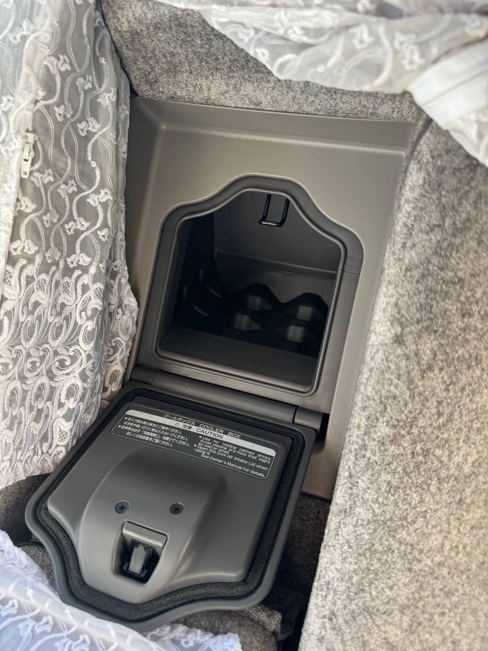 Interior features premium wool seats with original JDM white covers, two-mode digital/analog dash, head-up display, power-adjustable seats and steering wheel, power rear sunshade, and rear amenities including refrigerator, air purifier, and independent climate controls.